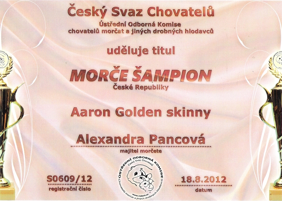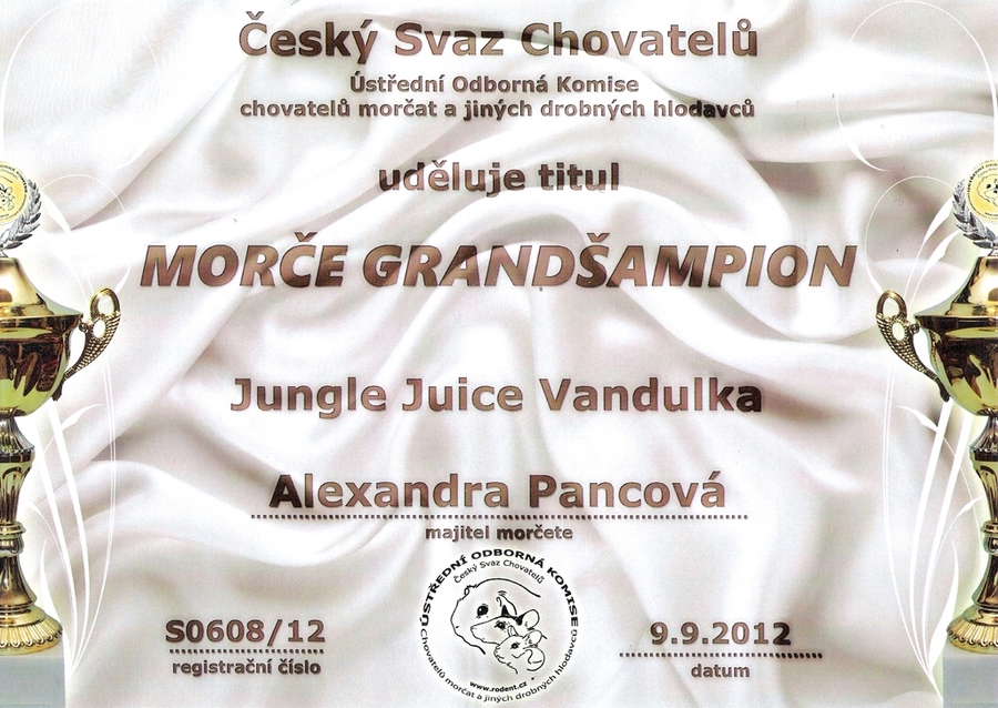9.9. 2012 9. výstava morčat v Lounech při výstavě Člověk v přírodě- 95,5 b., 5. kartička, splnění podmínek pro získání titulu grandšampion