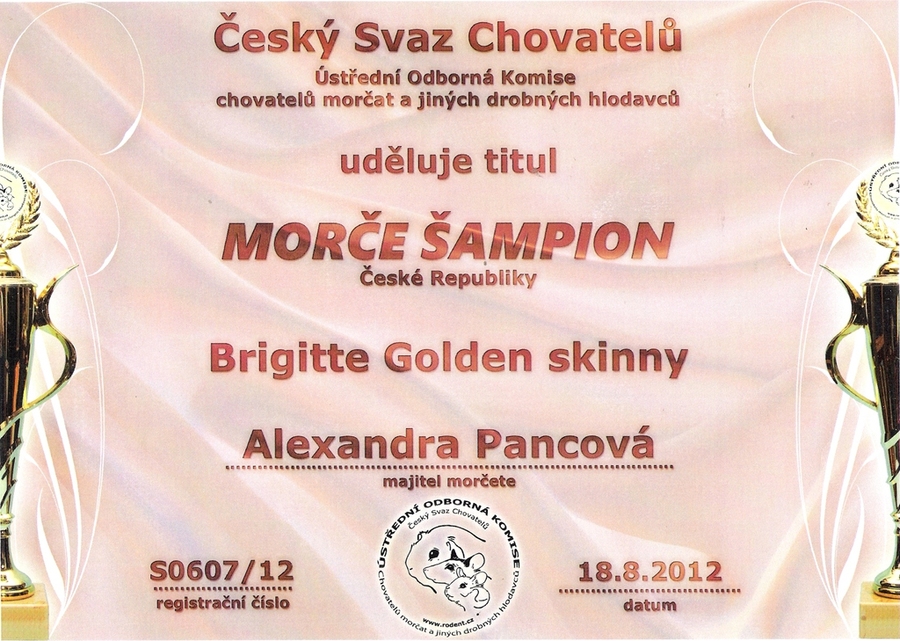 9.9. 2012 9. výstava morčat v Lounech při výstavě Člověk v přírodě: 96,5 b., 3. nejlepší skinny třída junior, 2. kartička na grandšampiona
