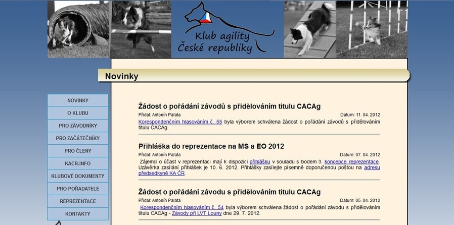 Stránky klubu agility ČR jsou pro mě zcela nepostradatelné :-). Naleznete zde i herzky zpracovaný termínový kalendář závodů a veškeré informace kolem agility.