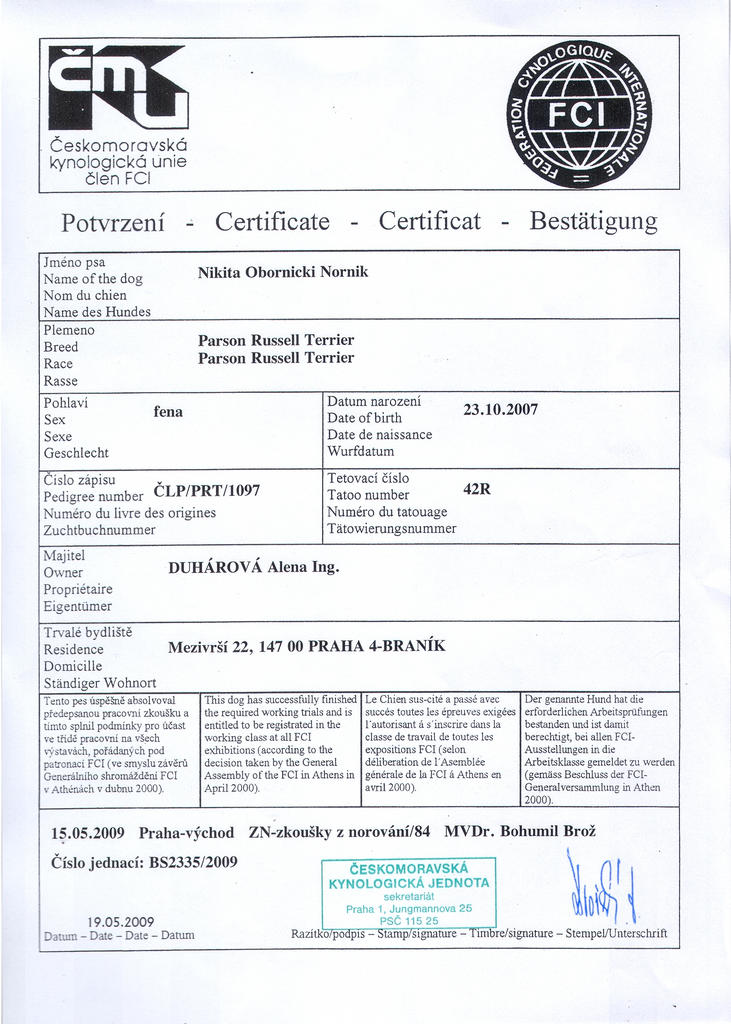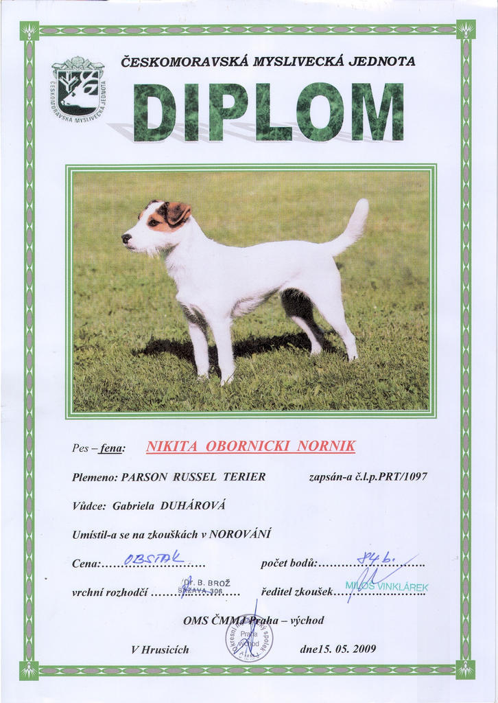 Naše začátky norování na umělé noře nebyly až tak dobré. Když jsme poprvé navštívili cvičiště u pana Vargy, Nikita víc dorážela na pána, než na lišku, i když byla přímo před ní uzavřená v bedně. Tehdy byla Nikita mladá, a tak jsme si z toho hlavu nedělali. Po čase jsme začali navštěvovat umělou noru v Hrusicích u Prahy, která byla pro nás dostupnější. Už při prvním nácviku bylo vidět, že trochu vyspěla a hned se chovala úplně jinak. Na lišku začala štěkat opravdově a ne jenom bázlivě odstrašovat. Až na to, že cesta tam a zpátky nám trvala dvě hodiny a na místě jsme většinou byly tak maximálně deset minut, jsem byla z Nikity opravdu nadšená. Už při druhém nácviku byla po vystoupení z auta úplně nepříčetná, přestala vnímat a nezajímalo ji nic jiného než lákavá liška v noře. A tak jsem se rozhodla přihlásit na zkoušky v norování, které se zde měly konat 15.5.2009. Jediné čeho jsem se bála bylo, že než se liška dohnala do druhého kotle, tak to Nikitu přestalo bavit čekat a snažila se k ní dostat vnějškem, když ji nepustí hned za liškou. Takže s opuštěním nory jsem si moc jistá nebyla, ale zkusit jsme to mohli.