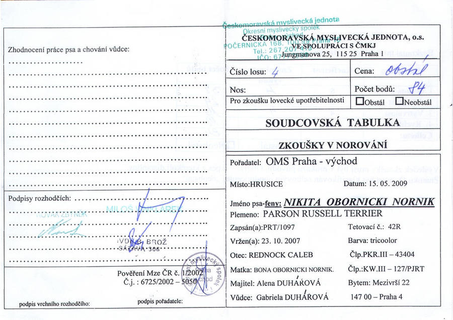 A tak jsme 15. v pátek ráno vyrazily po osmé hodině z Prahy a jeli do Hrusic. Přejímka psů v propozicích byla napsána od 9 hod do 9:30 hod. Na místo jsme dorazili asi dvě minuty po deváté a už mi z legrace vyhrožovali pokutou 500 Kč za zpoždění. Až na dva psy tam byli všichni, a tak nebylo ani čtvrt na deset a začalo slavnostní troubení, losování a kontrola čipů. Celá řada psů nedočkavě štěkala, ale jenom Nikita byla úplně nepříčetná. Jako by dočista přišla o rozum. Nicméně jsme si vylosovala pořadí 4. A byla jsem s ním nadmíru spokojená. V blízkosti nory musí být klid a tak jsem se s ní musela procházet opodál, aby nerušila pracující psy. Když jsme se konečně dostali na řadu a já měla přednést prohlášení, že jsme obě připravené ke zkoušce a když rozhodčí viděl Nikitu ustavičně dorážející ať už jí pustím dovnitř, raději mi řekl, že nic říkat už nemusím a můžu jí tam pustit, aby se nezbláznila. Nemusela jsem ani dávat žádný povel, Nikita zajela do nory jako ďas. Zrovna na nás vyšla nějaká nezkušená liška, která na přepážku dorážela, a to se psovi opravdu líbilo. Nikita začala kousat do mřížky a v tom rozhodčí zavelel, ať pustí lišku dál do druhého kotle. A už tu byl první problém, kterého jsem se bála. Samozřejmě ještě k tomu, když ta liška byla tak suprová. Nikita ji nechtěla ani na chvíli spustit z očí, a tak ji šla sledovat zvenku. Ani mě to nějak nepřekvapilo, ale jak Nikita běhala po noře, začala jsem couvat k začátku nory. Když mě koutkem oka Nikita spatřila a viděla, že přepážka byla uvolněna. Největší rychlostí, jakou jen dokázala získat, se znovu ponořila do nory. Z předem přečteného zkušebního řádu jsem věděla, že když ji nedám povel nebo jí nepomůžu zpátky k noře a sama se tam vrátí, tak se to jako opuštění nory nepočítá. U druhého kotle se opět zakousla do mřížky a následně byla puštěna dál. Na konci jsem ji odchytla a hned ji pustila norou ještě jednou na rychlost. Z toho jsem neměla nejmenší obavy. Na nácviku mi noru běhala kolem 8 s. Jako zběsilá běžela norou, když nečekala, že na konci je jako znamení, že pes je tam, instalovaná větvička. Nevím jestli se na ní zachytly chlupy z lišky, nebo byla jen zvědavá, nicméně si jí tam 6 s očuchávala než s ní zatřásla. Kvůli tomu jsme měli čas 14 s, ale i přesto jsem byla celkově spokojená. Když jsem se pak bavila s jedním normistrem, vyprávěl mi, že jednou se pes u větvičky také zastavil a větvička náhle zmizela do nory. Tak jsem ještě měla docela štěstí.